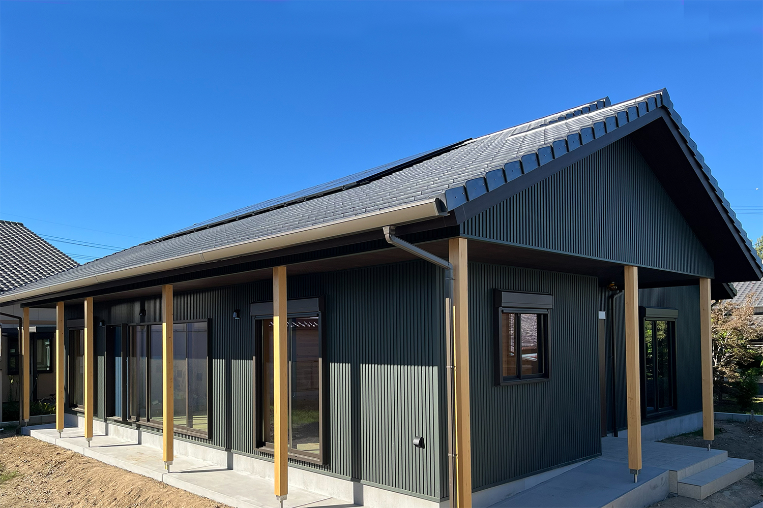 外壁=ガルバリウム鋼板。軒の出を深く、太陽光も設置しました