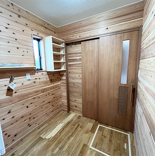 杉板張りの洗面脱衣室