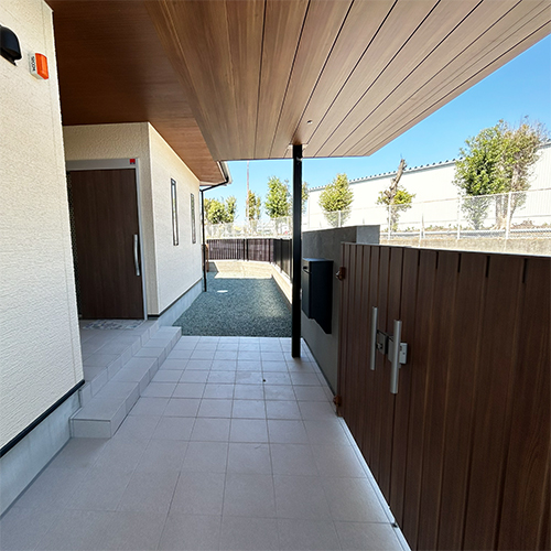 建物とラインを揃えたアプローチ、フェンス