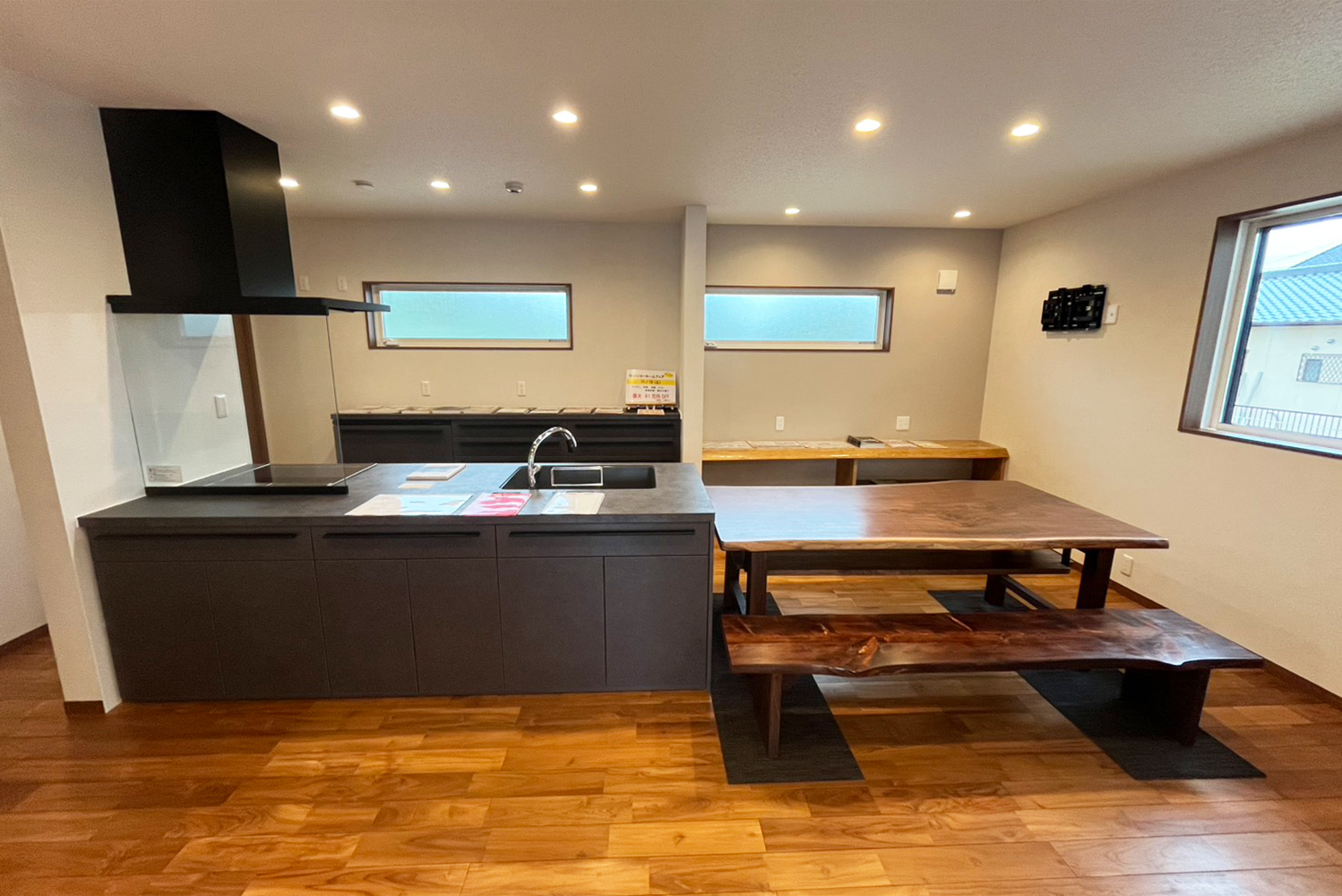 ウォルナットの無垢一枚板テーブルと、長椅子を設置