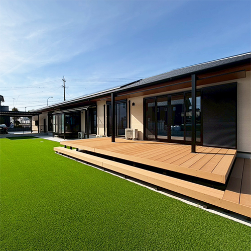 アウトドアリビングとしても使える、ウッドデッキ+人工芝